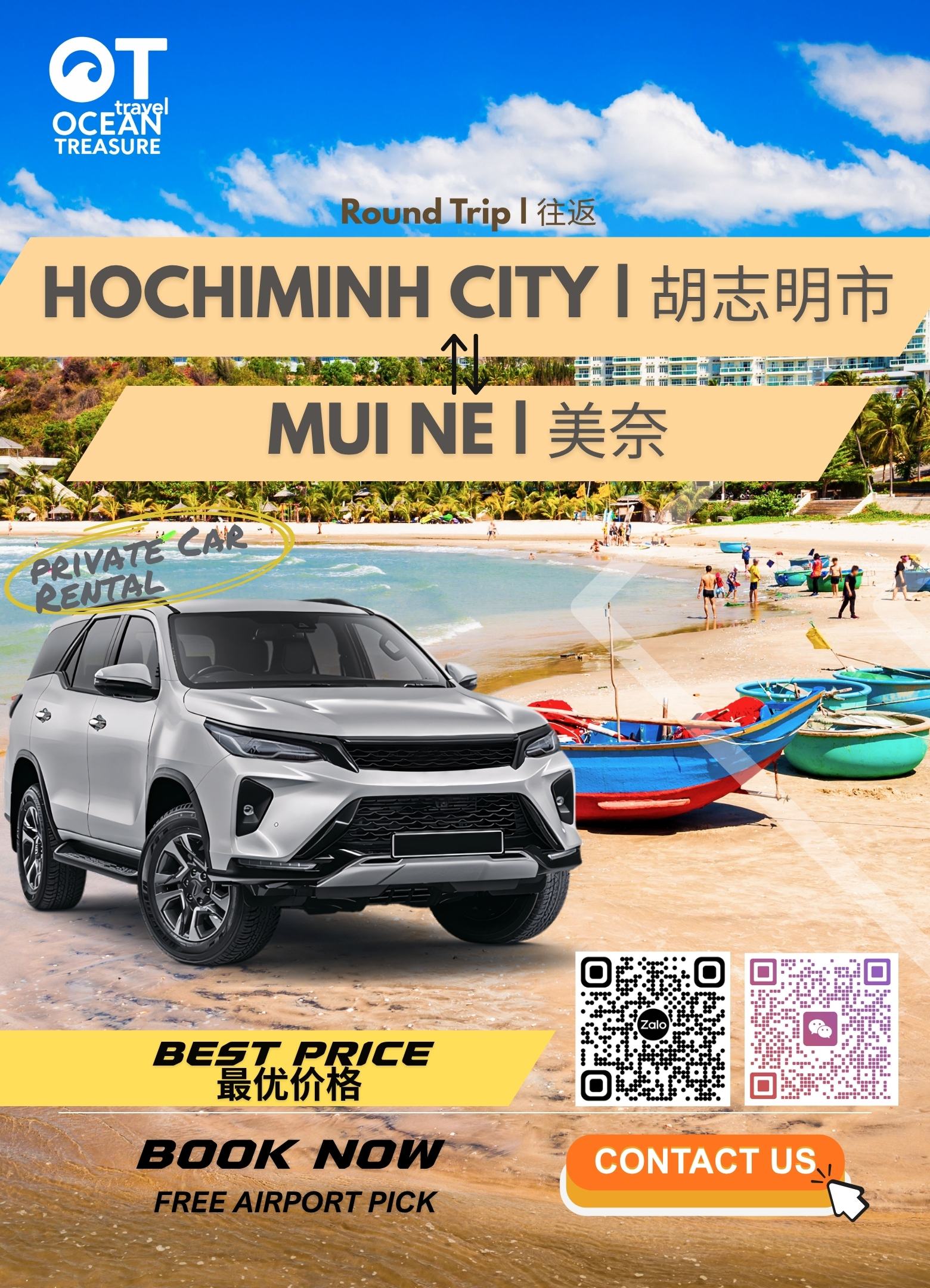Để nhận tư vấn và báo giá phù hợp cho tuyến [HCMC – Mũi Né] Thuê xe riêng di chuyển từ TP. Hồ Chí Minh đến Mũi Né trong ngày, vui lòng liên hệ Ocean Treasure Travel để được hỗ trợ nhanh chóng.