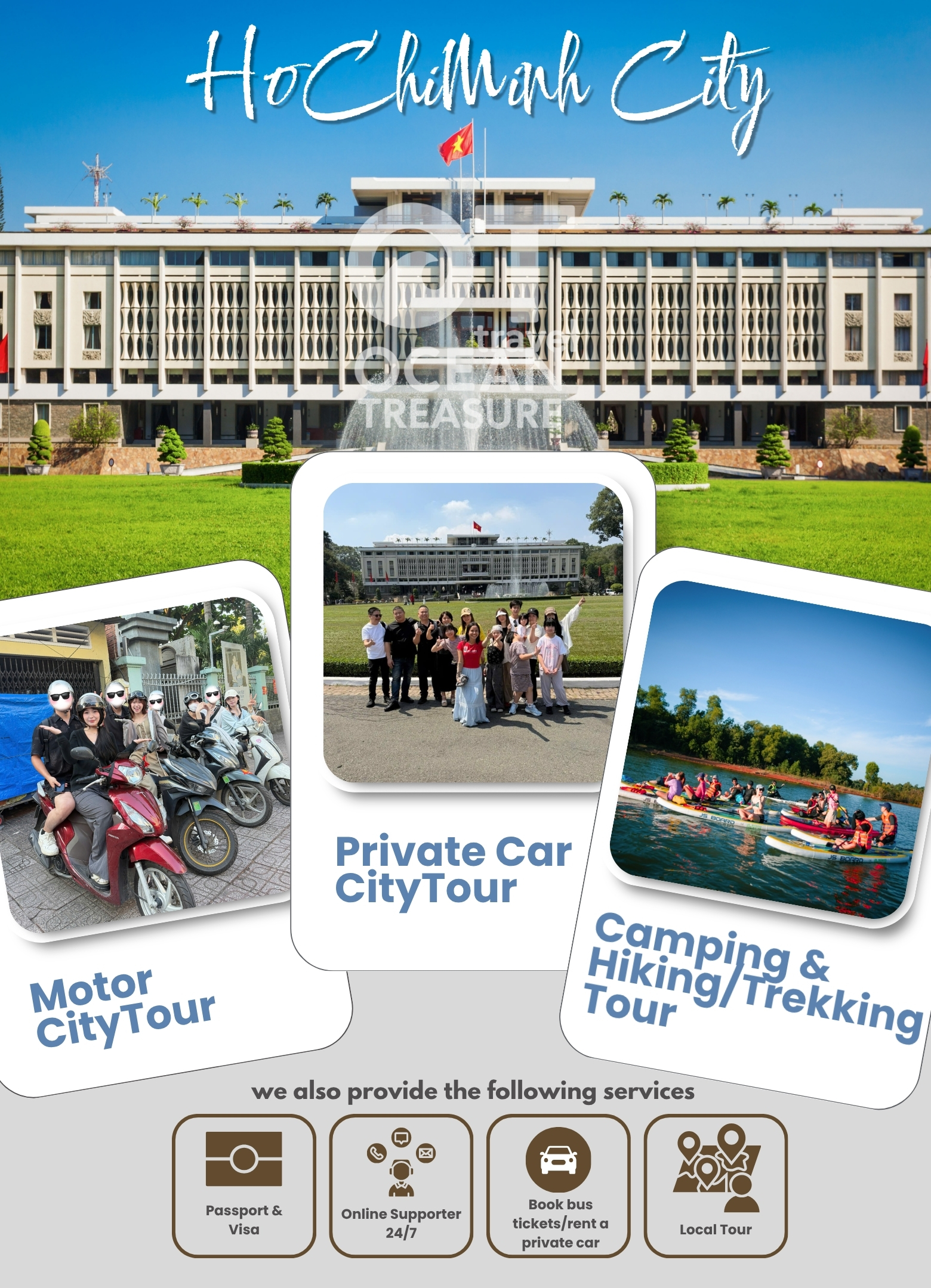 𝐎𝐜𝐞𝐚𝐧 𝐓𝐫𝐞𝐚𝐬𝐮𝐫𝐞 𝐓𝐫𝐚𝐯𝐞𝐥 为您提供多样化的胡志明市一日游体验,包括 Motor Tour(摩托车体验游)、City Tour(城市观光游),以及 Camping / Hiking / Trekking(露营 / 徒步 / 健行) 等特色行程。
